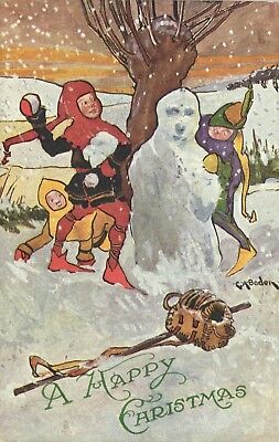 Title (ebay affiliate link): Snowman, Children Hiding Behind a Snowman in a Snowball Fight, Christmas, Old Pc