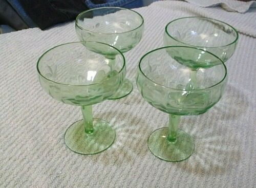 Title (ebay affiliate link): 4 VINTAGE ETCHED GREEN DEPRESSION GLASS SHERBET/CHAMPAGNE GLASSES STEMS