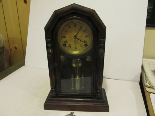 ANTIQUE 1871 - INGRAHAM - DORIC - MANTLE CLOCK - EIGHT DAY - TALL WOOD CASE runs