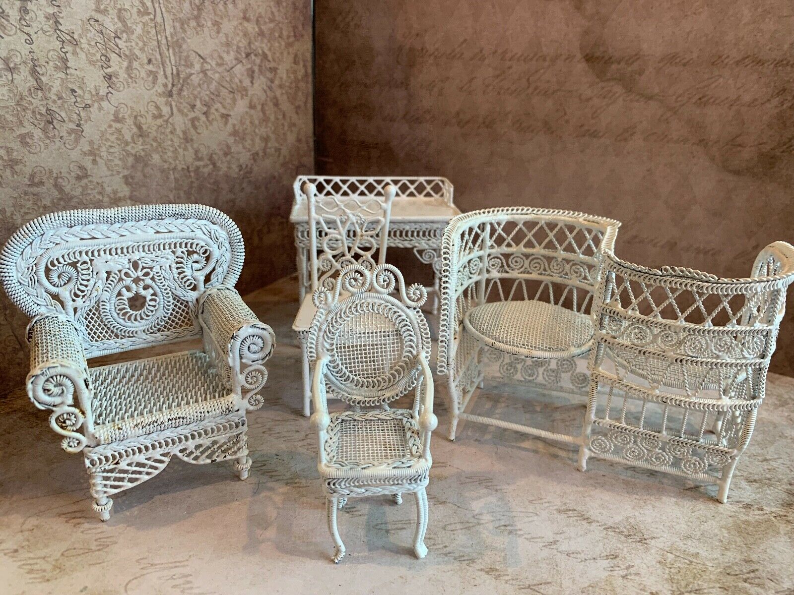 Vintage Miniature Dollhouse 5 Pcs White Wire Wicker Furniture Easy To Paint 1:12