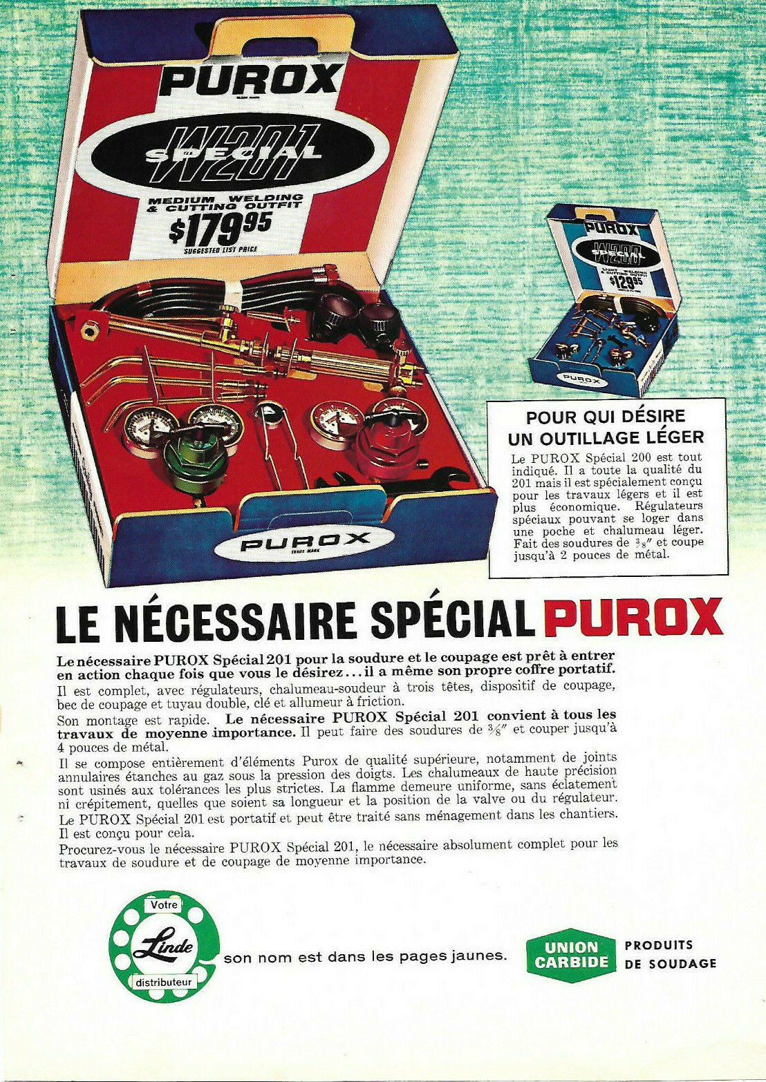 Title (ebay affiliate link): 1964 PUROX W201 SPECIAL MEDIUM WELDING & CUTTING OUTFIT ORIGINAL AD IN FRENCH