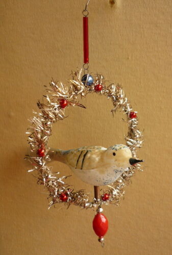 VTG.GLASS BEADED BIRD CHRISTMAS TREE ORNAMENT IN TINSEL ROUND