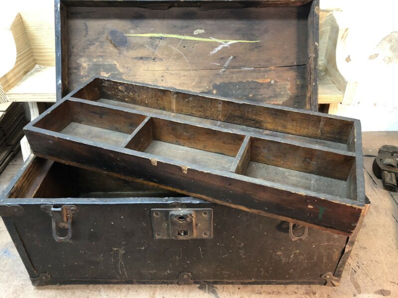 Title (ebay affiliate link): Antique Wood Machinist Toolbox Tool Box w tray, leather handle, stamped U-Need-A