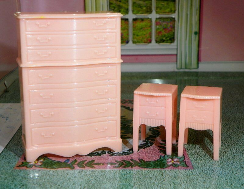 Title (ebay affiliate link): Renwal PINK BEDROOM DRESSER & SIDE TABLES Vintage Dollhouse Furniture Ideal Size