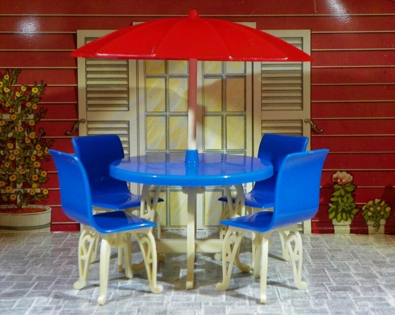 Plasco PATIO TABLE, UMBRELLA, CHAIRS Vintage Dollhouse Furniture Ideal Renwal sz