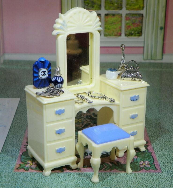 Title (ebay affiliate link): MINT! Ideal VANITY DRESSER & BENCH Vintage Dollhouse Furniture Renwal Miniature