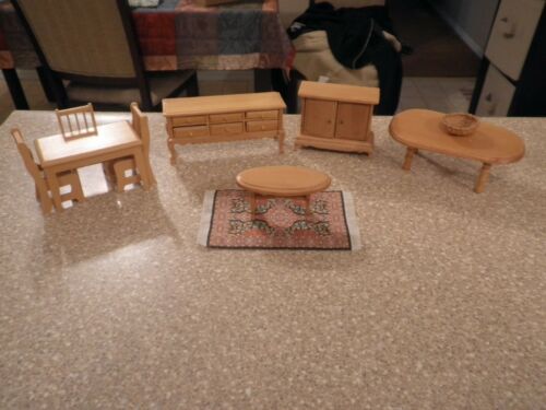 Title (ebay affiliate link): Lot of 10 Vintage Wood Dollhouse Furniture Kitchen & Coffee Table Dresser Rug +