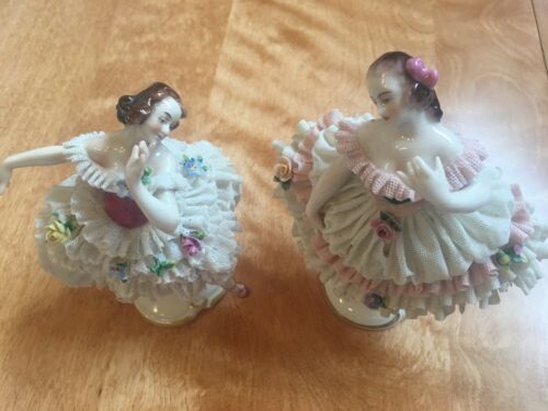 Vintage Porcelain Lace Ballerina Figurines, Set of 2 Dancers, Dresden Germany
