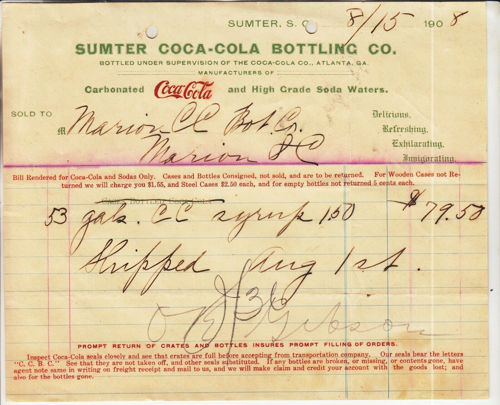 SUMTER COCA-COLA BOTTLING CO. INVOICE DATED 8/15, 1908 111 YEARS OLD