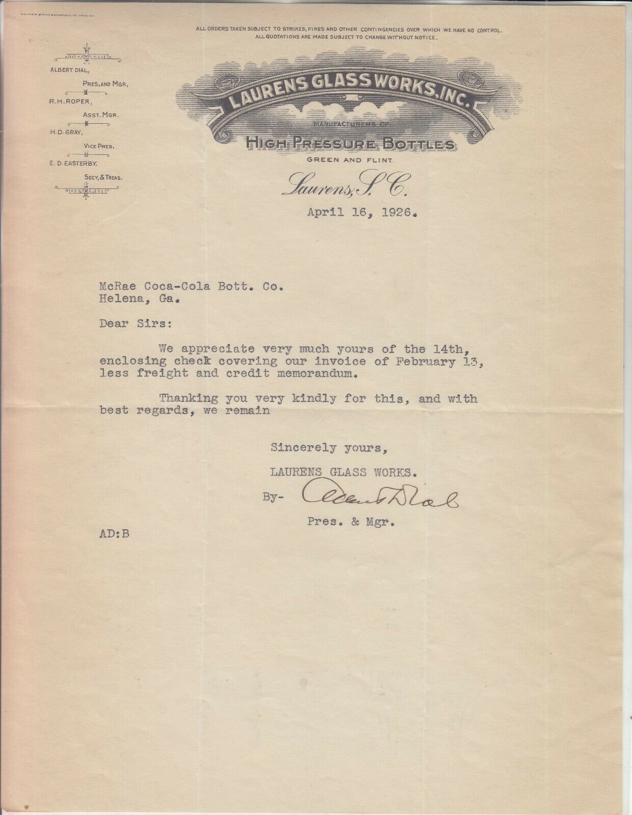 LAURENS GLASS WORKS INC LETTERHEAD DATED APRIL 16, 1926