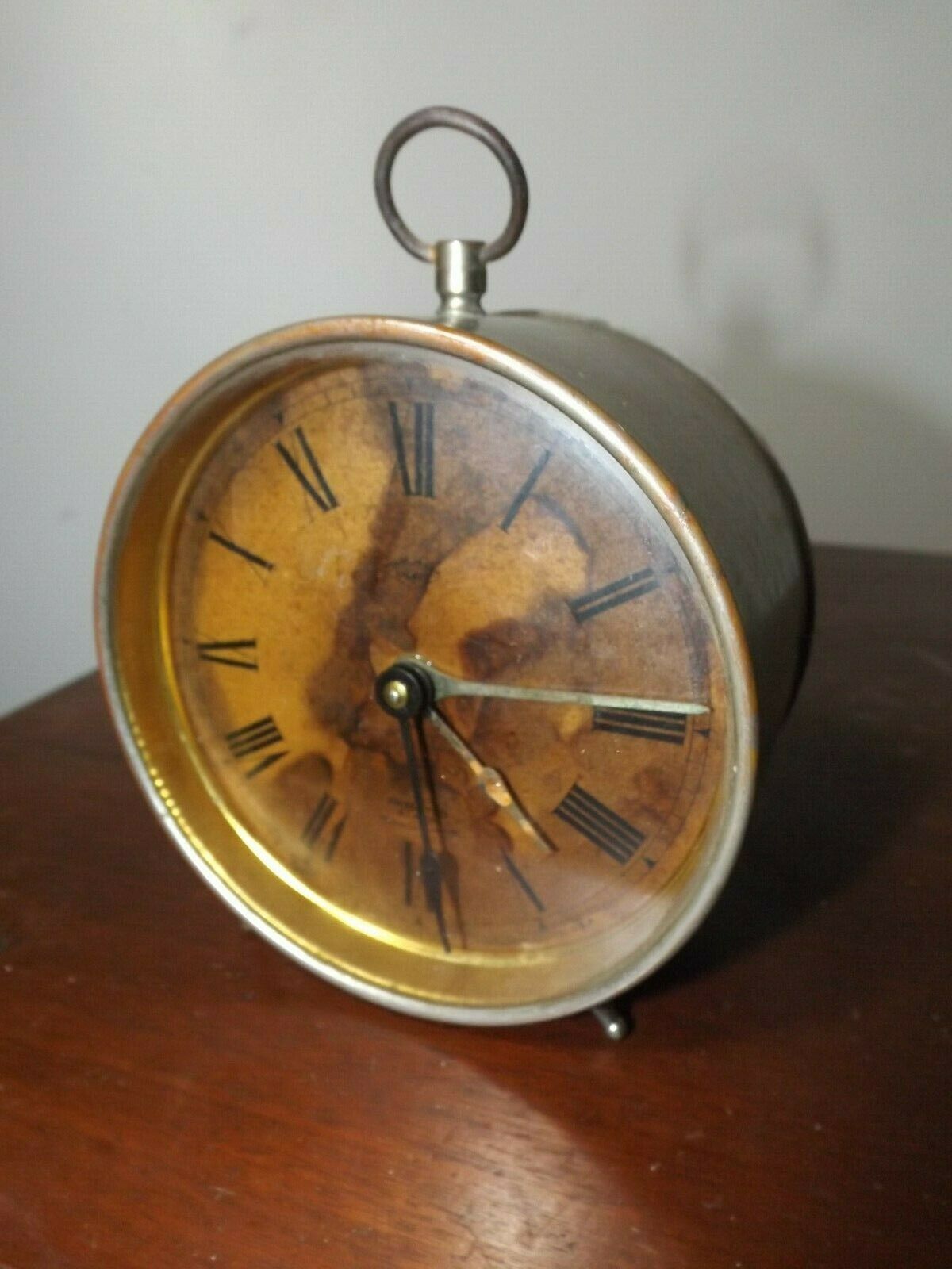 Title (ebay affiliate link): Antique 1900s Charles Parker Nickel Plated Peg Leg Table Alarm Clock Runs Chimes