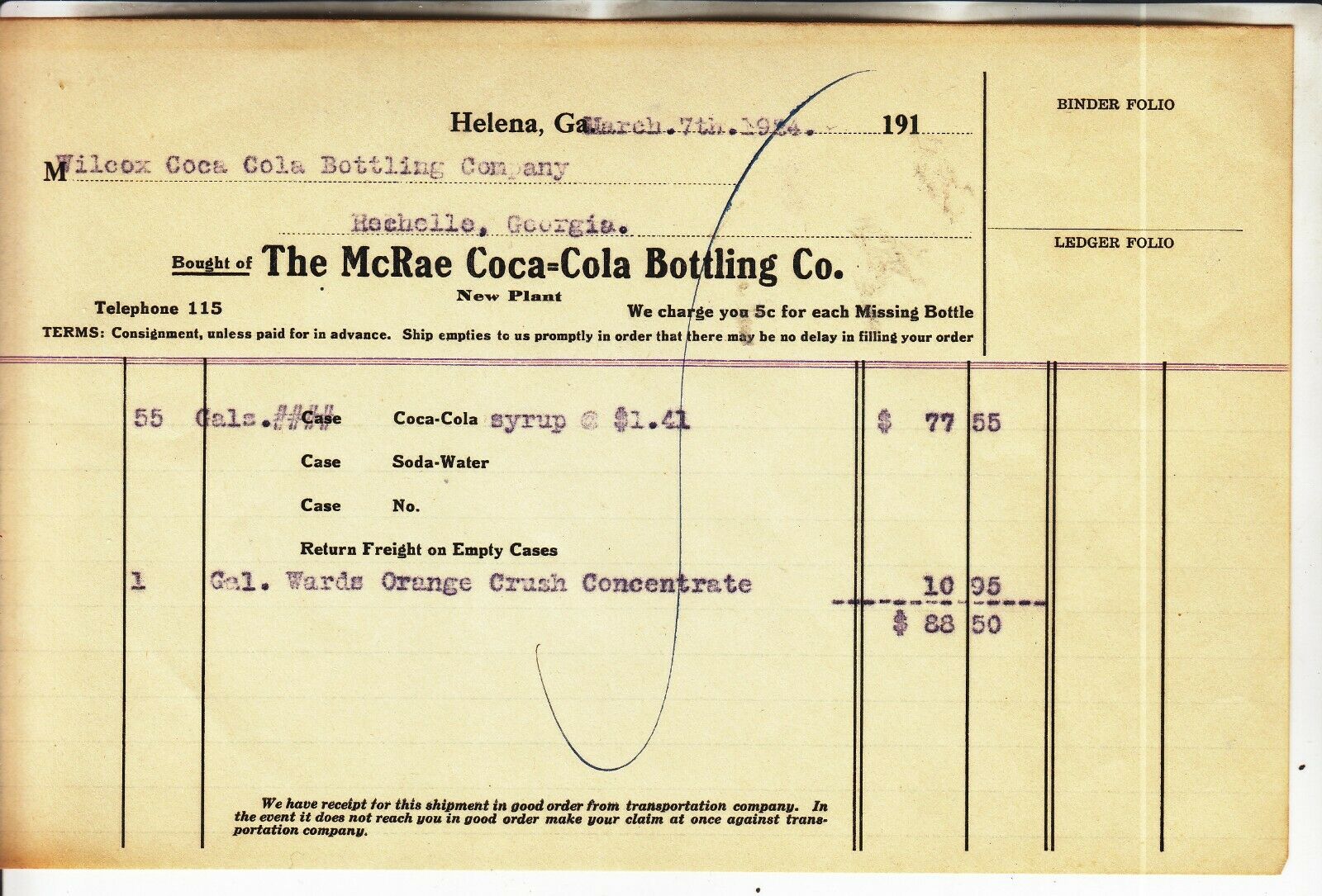THE McRAE COCA-COLA BOTTLING CO. INVOICE DATED MARCH 7th, 1924, 95 years old