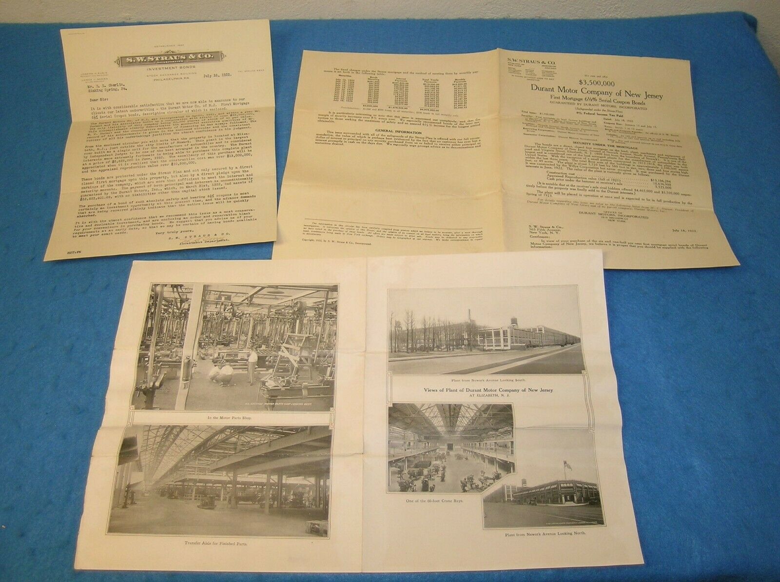 Rare 1922 DURANT MOTOR CAR Bond Offer Letters & ELIZABETH NJ PLANT Brochure