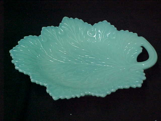 Title (ebay affiliate link): FENTON BLUE MILK GLASS LEAF PATTERN CANDY DISH BONBON TRINKET 8 1/2" LONG EXC.