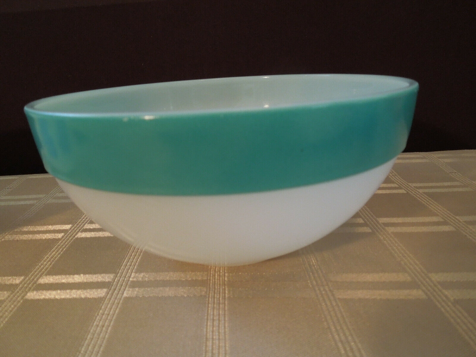Title (ebay affiliate link): Vtg VGC Fire King Colonial Band Bowls Turquoise 7.5" White Milk Glass Bowl