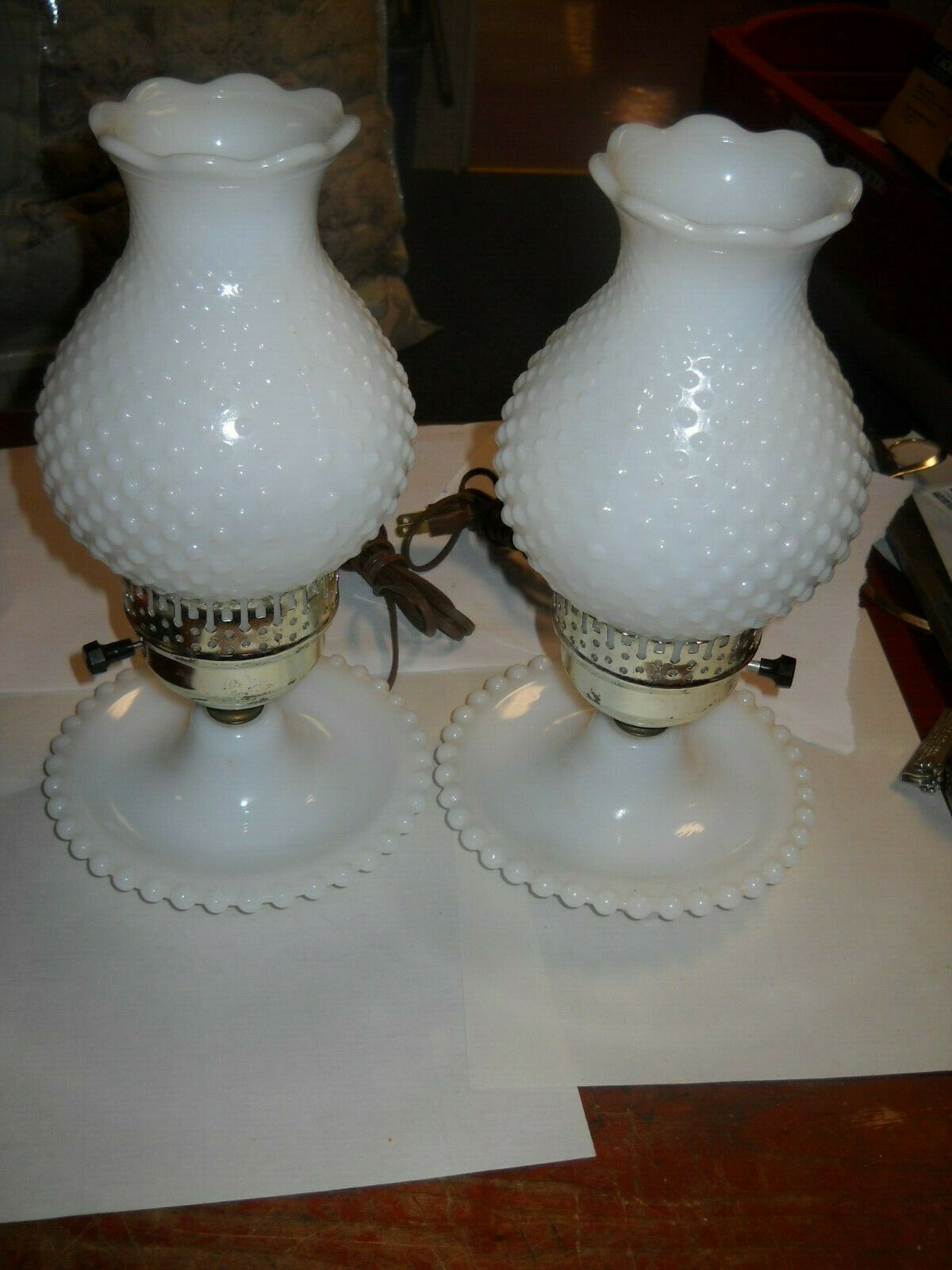 Title (ebay affiliate link): 2 Vintage 11" Milk Glass Hobnail Electric Night Stand Lamps