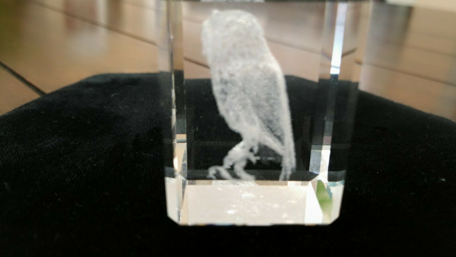 Title (ebay affiliate link): Paperweight Owl on Branch 3D Laser Etched Crystal Glass Tower 11/2"x11/4"x1"