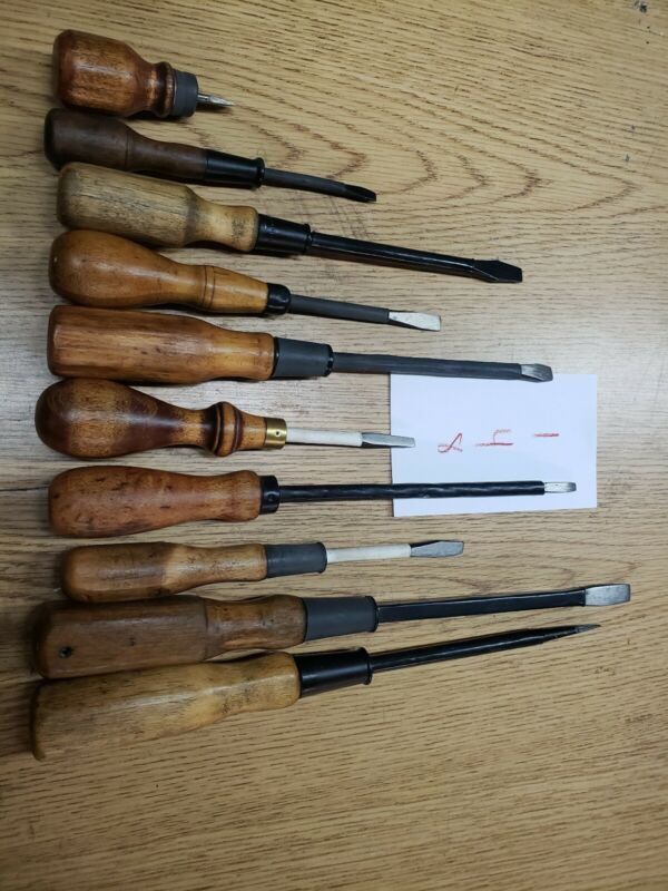 Title (ebay affiliate link): Lot of 10 Vintage Wood Handled Screwdrivers. Three Flatheads