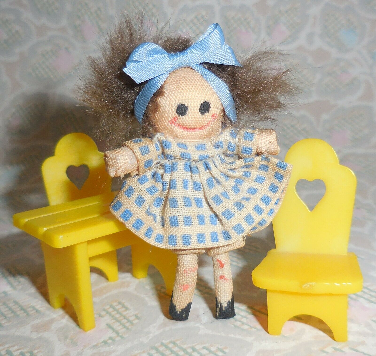 Vintage Tiny 1 7/8" Miniature Cloth & Wire Dollhouse Toy Doll with Furniture