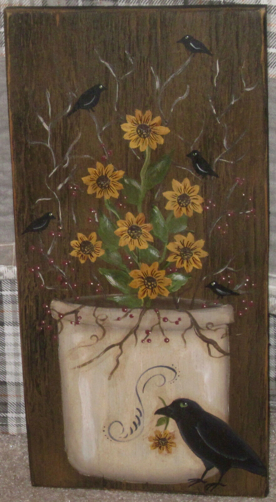 Title (ebay affiliate link): *~*PRIMITIVE*~* HP FOLK ART PRIM CROCK *~* SUNFLOWERS *~* CROW *~* BOARD