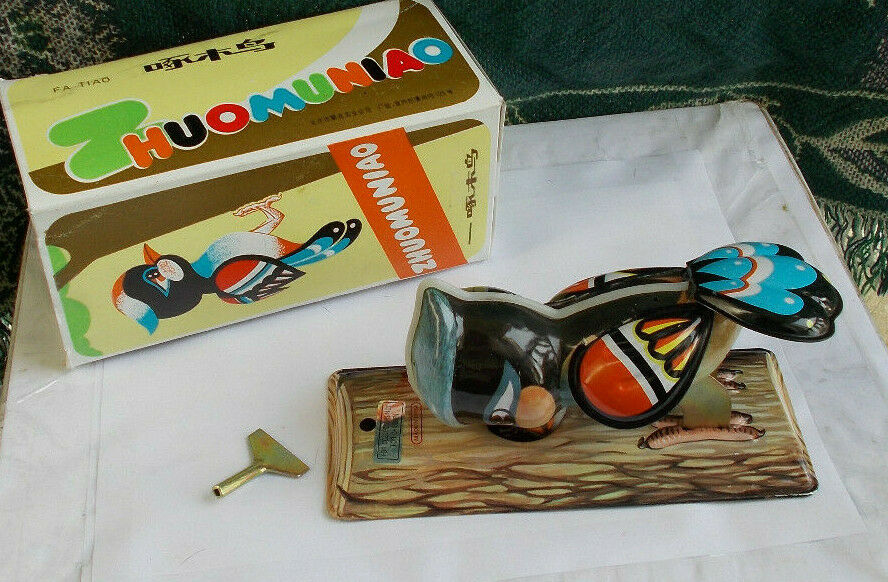 Title (ebay affiliate link): Vintage 7" Tin Wind Up Toy Bird Woodpecker & Box Zhuomuniao Wall Hanger Litho NR