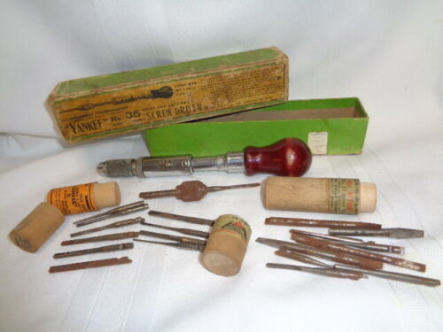 VINTAGE ANTIQUE TOOL YANKEE 35 SPIRAL RATCHET SCREW DRIVER BITS BOX SCREWDRIVER