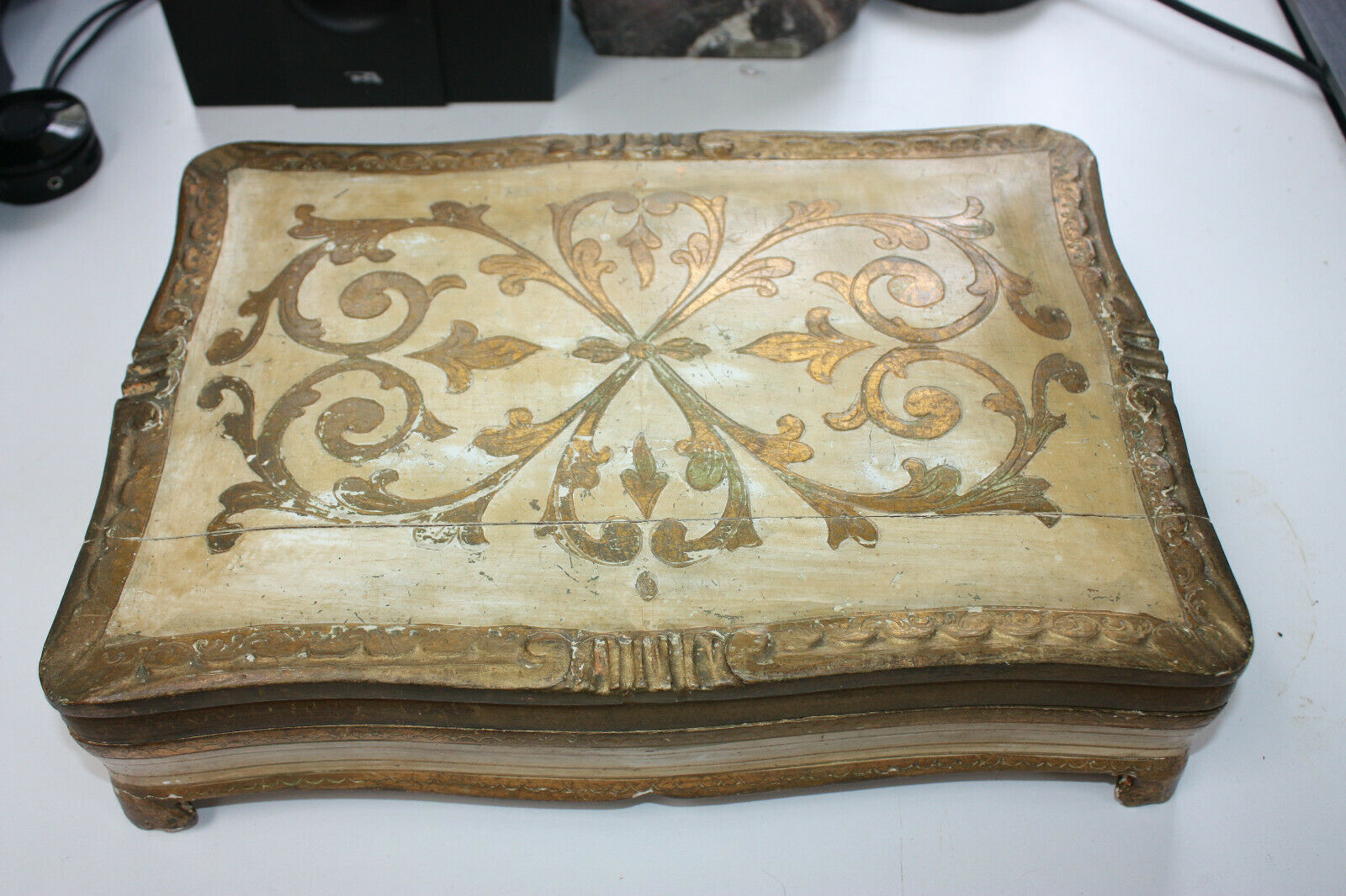 Title (ebay affiliate link): Vintage Italian Florentine wooden jewelry box gilded painted legged 13.5X5.5X2.5