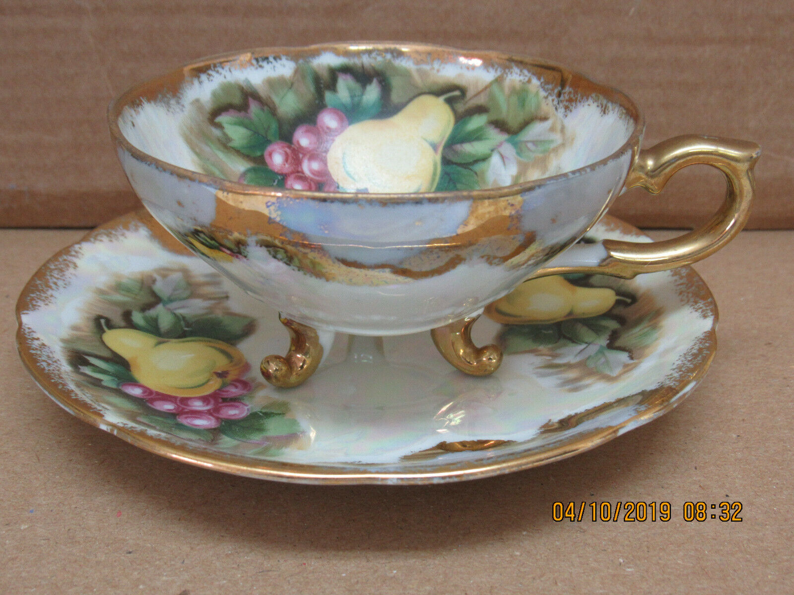 Title (ebay affiliate link): Vintage 3 Footed China Tea Cup & Saucer Set- Hand painted MOP fruit, gold trim