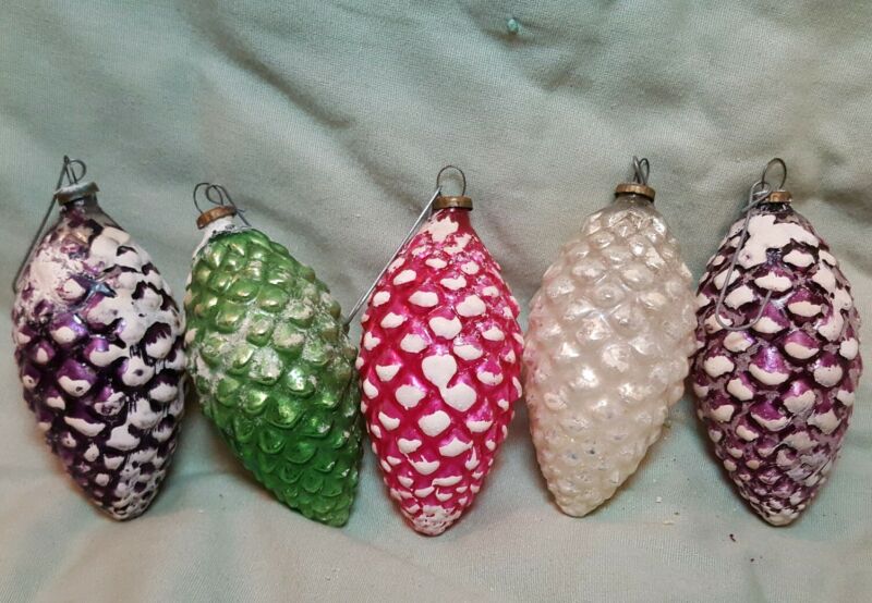 5PC ANTIQUE VTG MERCURY GLASS FLOCKED? PINE CONE CHRISTMAS TREE ORNAMENTS JAPAN