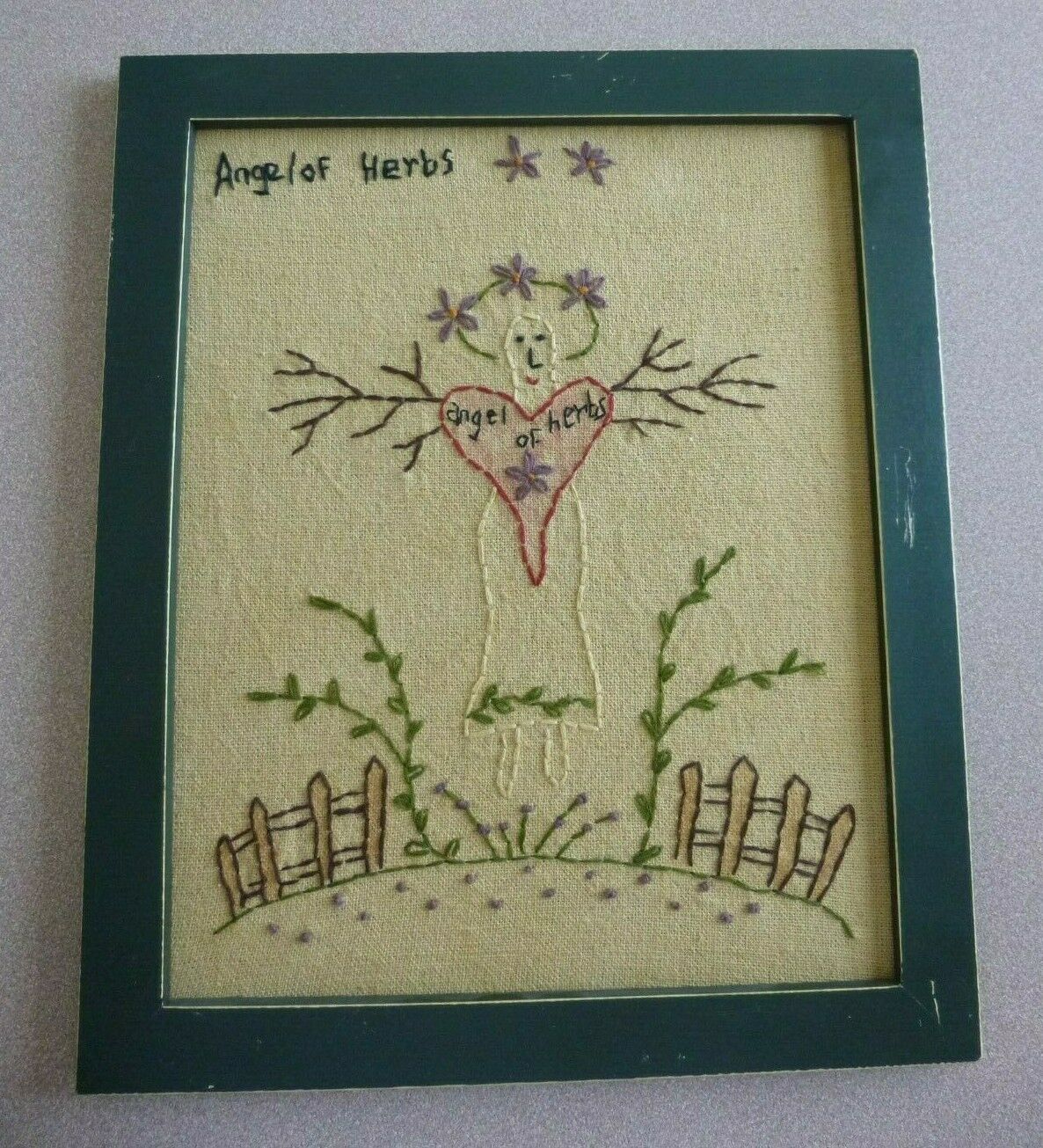 Title (ebay affiliate link): VINTAGE COUNTRY PRIMITIVE ANGEL OF HERBS EMBROIDERED FRAMED PICTURE