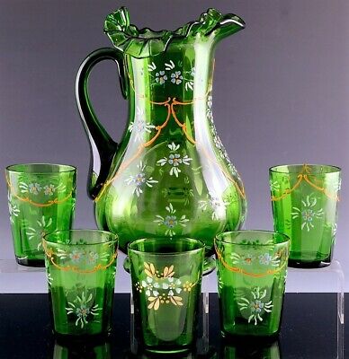 Title (ebay affiliate link): BEAUTIFUL 19thC VICTORIAN EMERALD GREEN FLORAL ENAMEL LEMONADE PITCHER GLASSES