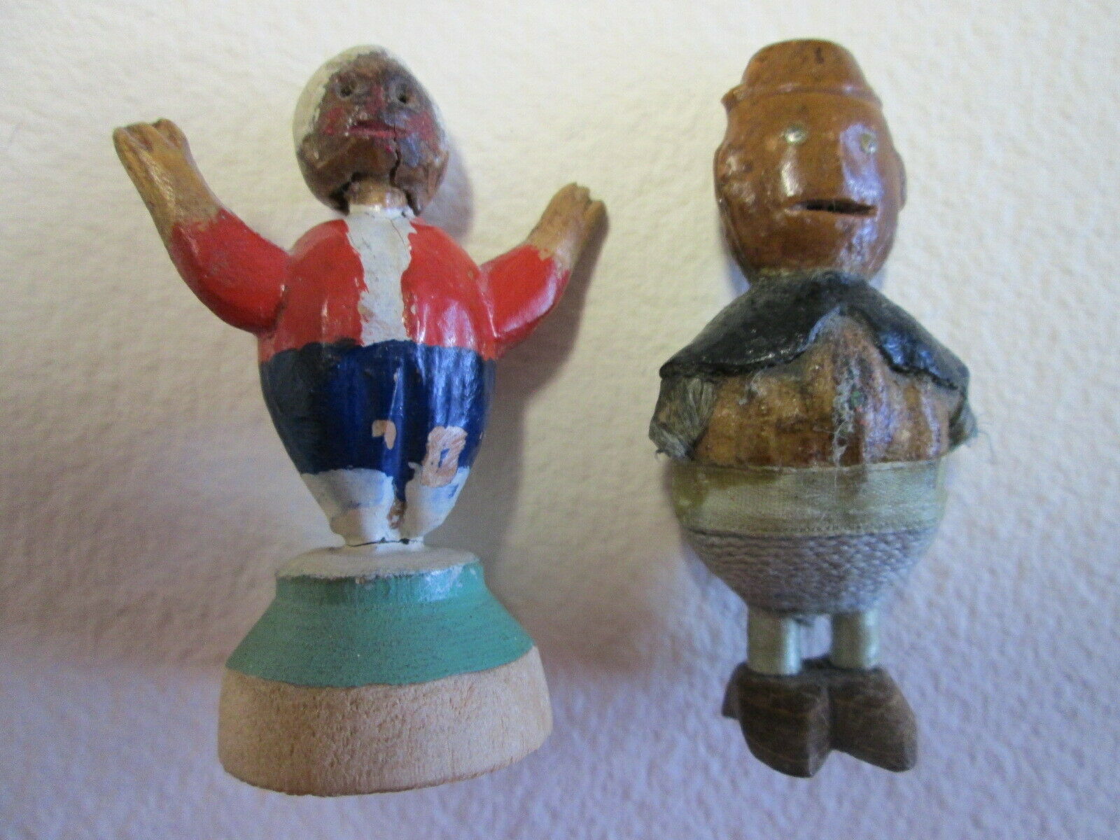 LOT OF 2 ANTIQUE HAND CARVED FOLK ART PEOPLE - NUTS & WOOD - 2 1/4" TALL