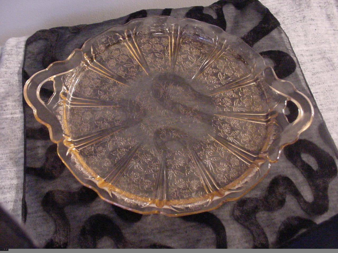 Title (ebay affiliate link): Depression Glass Cake Plate two handles Cherry Blossom pink