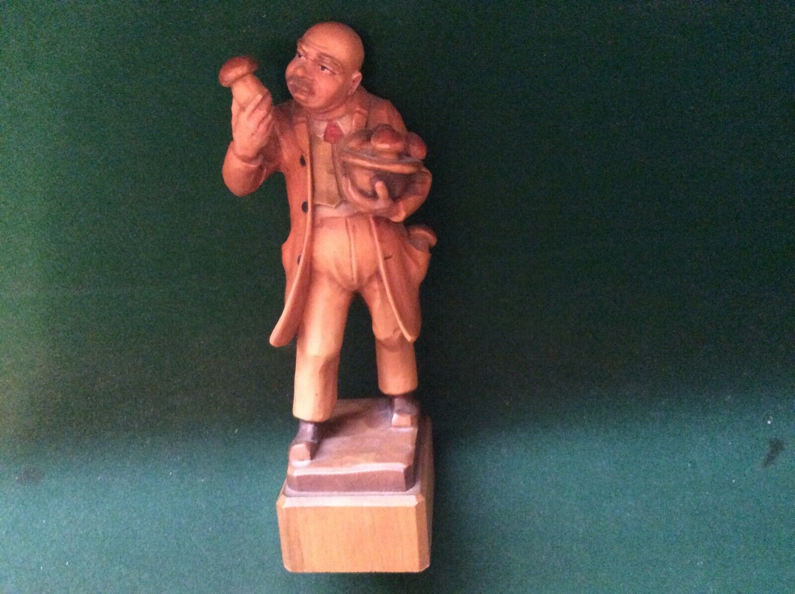 VINTAGE ANRI 7" CARVED MUSHROOM HUNTER, PICKER FIGURINE - N.R.