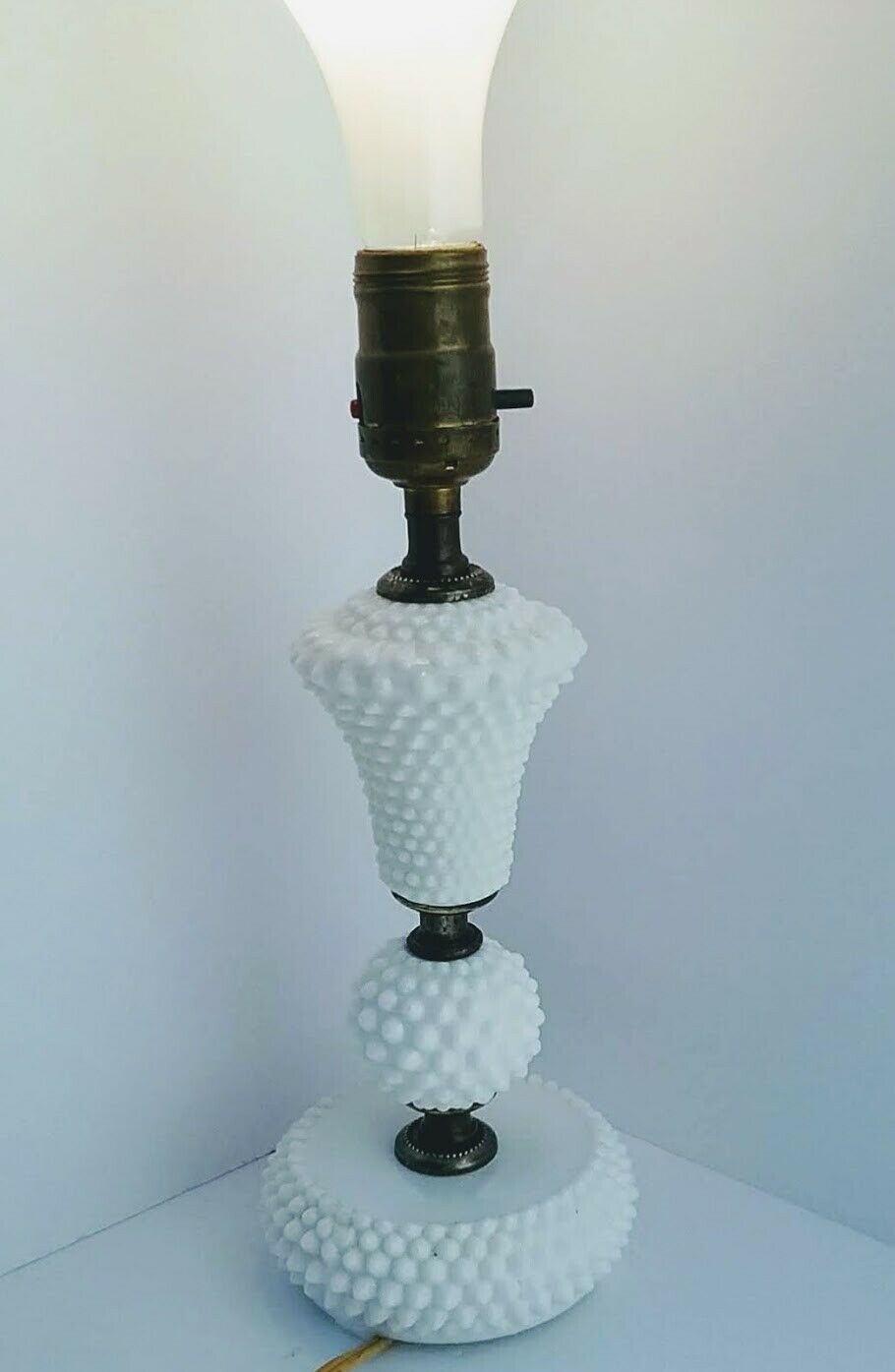Title (ebay affiliate link): Vtg. triple tier 11" inch Hobnail milk glass makeup table lamp.