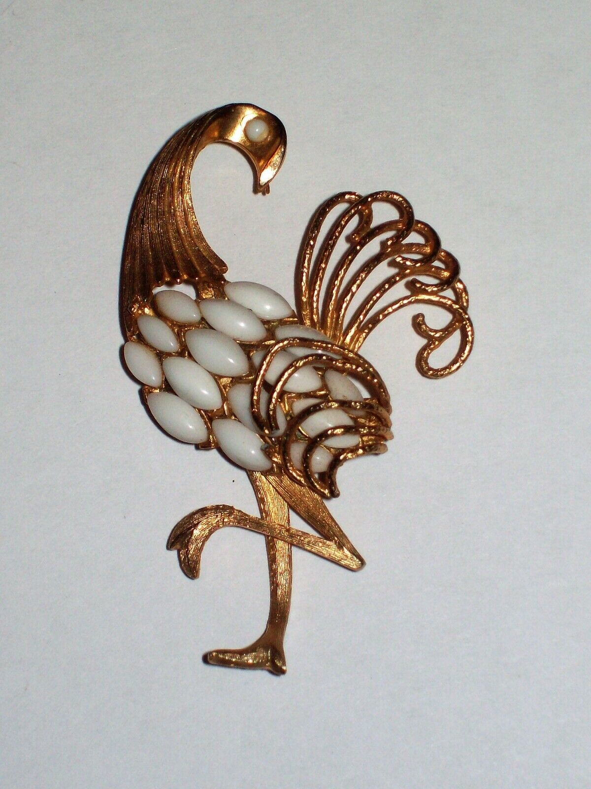 Vintage Corocraft Goldtone Milk Glass Ostrich Brooch