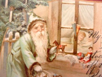 Title (ebay affiliate link): ANTIQUE VICTORIAN POSTCARD SANTA IN GREEN ROBE W/ VERSE