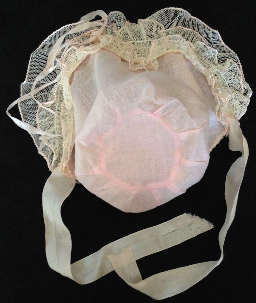 Vintage Baby Bonnet from Antique Bisque Head Doll Pink Cotton, Tulle Silk Ribbon