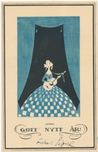 Title (ebay affiliate link): NERMAN: Lady in Blue Dress Playing Guitar, "Happy New Year" Used