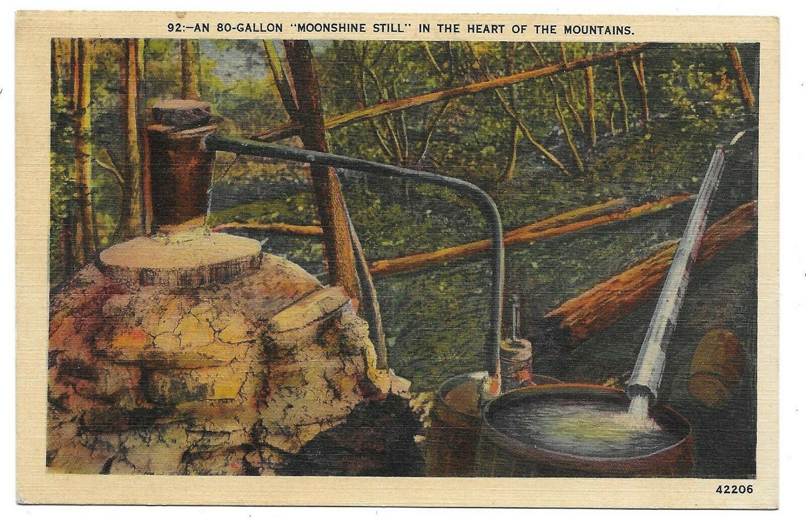 Title (ebay affiliate link): 80-GALLON "MOONSHINE STILL" IN THE HEART OF THE MOUNTAINS VINTAGE LINEN POSTCARD