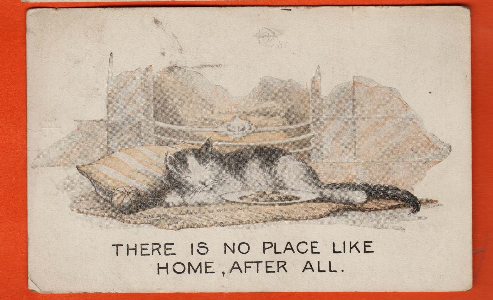 Comic postcard/ cat sleeping/ pillow/ "...no place like home..."/non-linen