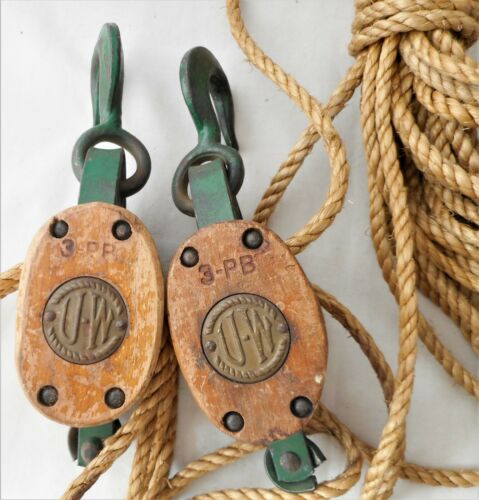 Title (ebay affiliate link): Antique Vtg Block & Tackle UW 3-PB Upson Walton Wood & Iron 50+/-Foot Hemp Rope