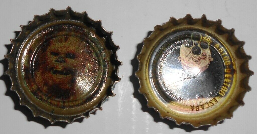 Title (ebay affiliate link): 2 VTG STAR WARS CHEWAKA DROID CAPSULE ESCAPE COCA COLA FANTA BOTTLE CAPS MEX 80s