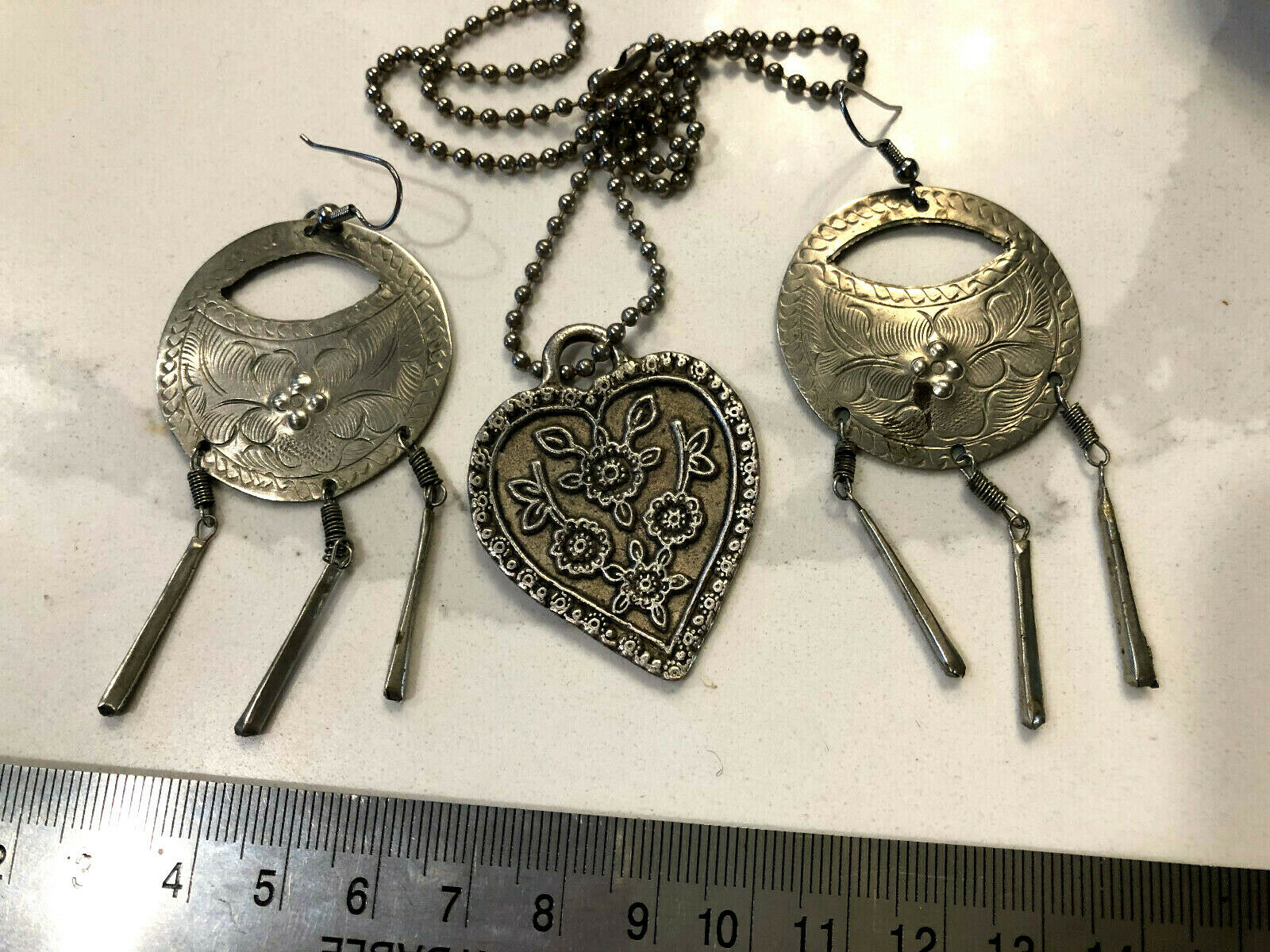 Title (ebay affiliate link): Antique dangle earrings heart pendant necklace lot silver tone