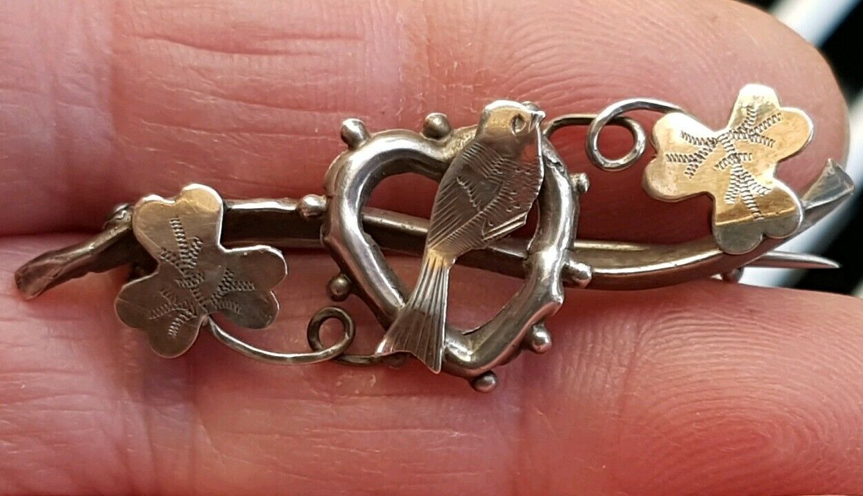 Title (ebay affiliate link): ANTIQUE WBs JEWELLERY GOLD SILVER BIRD HEART SHAMROCK SWEETHEART BROOCH PIN H/M