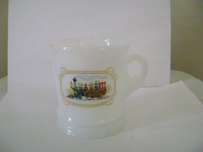 VINTAGE AVON WHITE MILK GLASS SHAVING MUG TRAIN MOTIFF