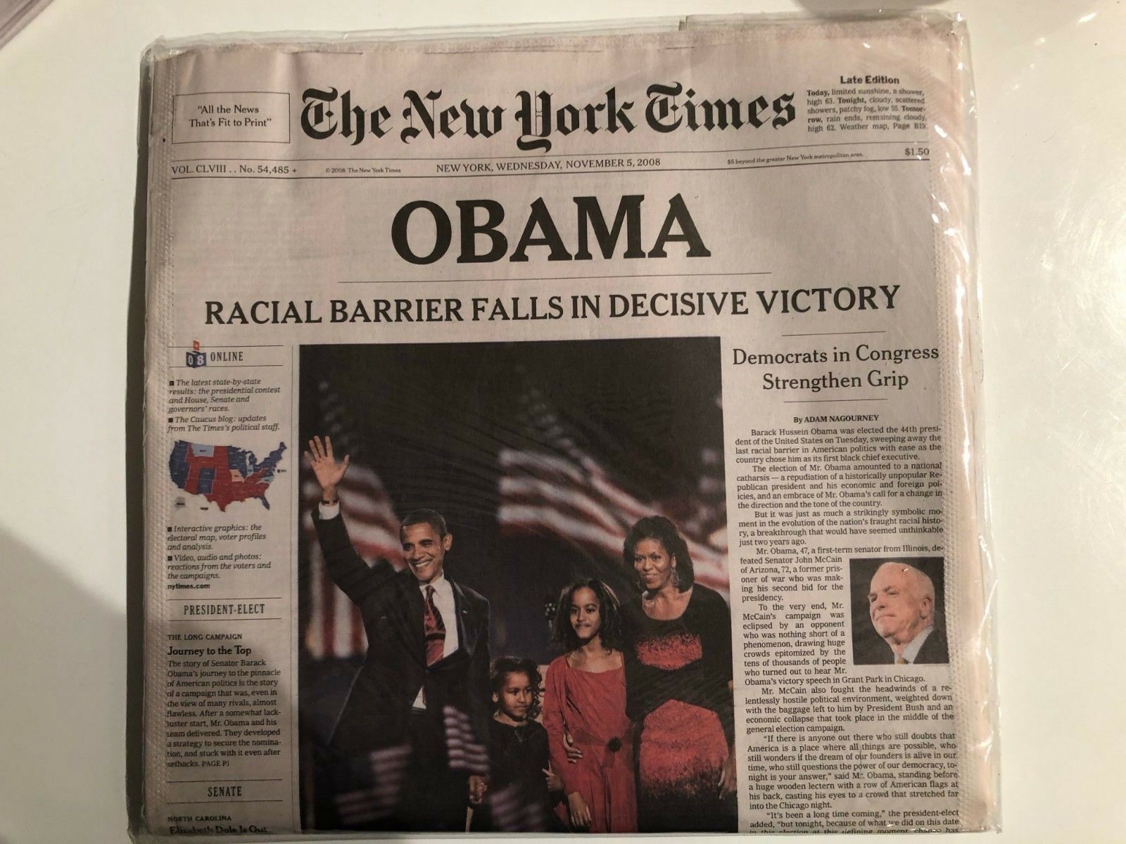 Title (ebay affiliate link): The New York Times OBAMA Wed. Nov. 5, 2008 RACIAL BARRIER FALLS Newspaper NYT