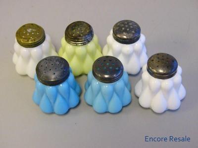 6 ANTIQUE MILK GLASS SHAKER BULGING TEARDROP WHITE BLUE