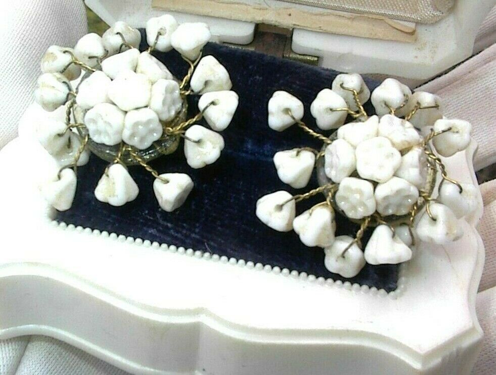 ANTIQUE ESTATE MIRIAM HASKELL WIRED MILK GLASS FLOWER PAT # STERLING EARRINGS