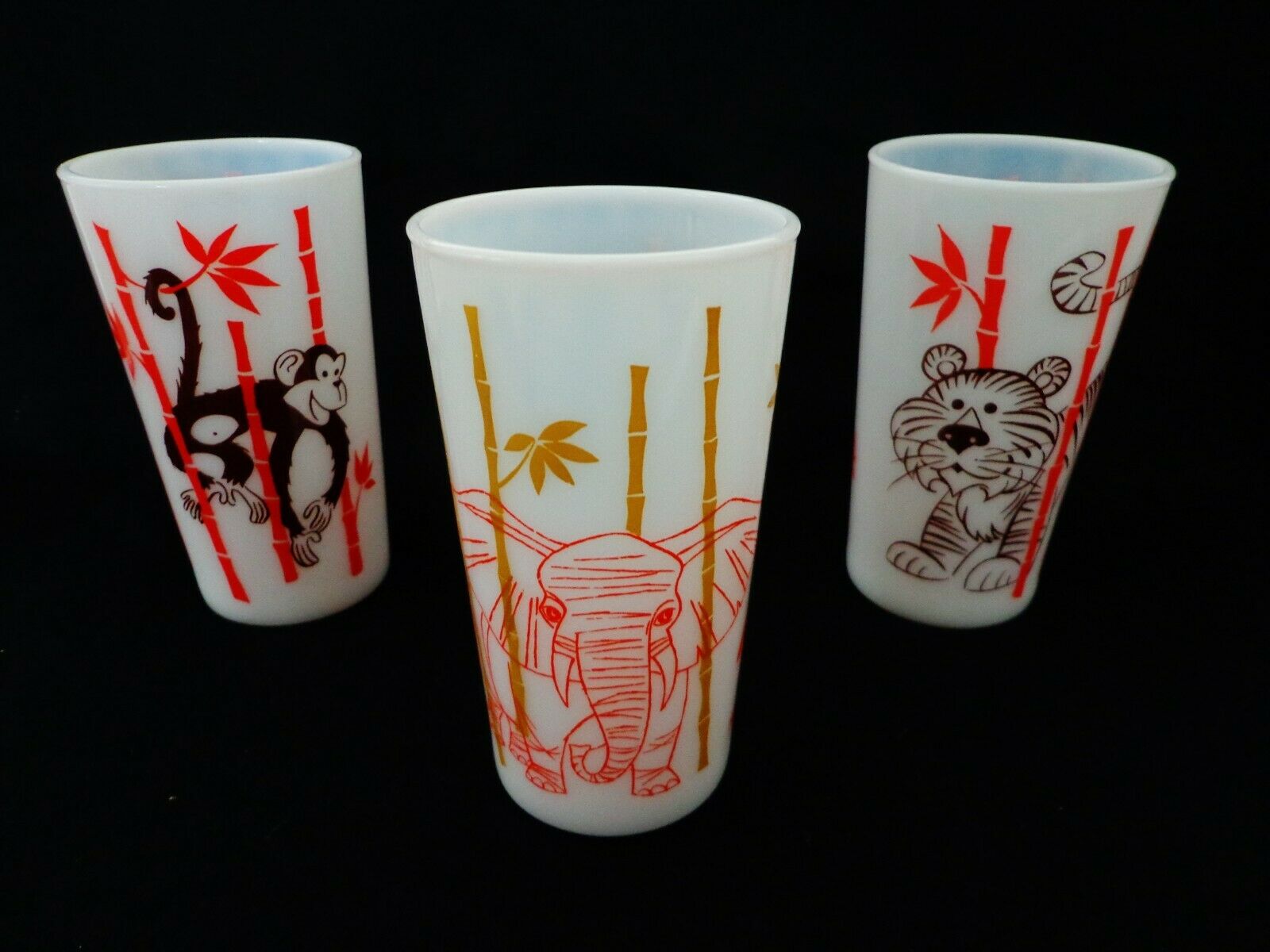 Title (ebay affiliate link): (3) HAZEL ATLAS CCC OPAQUE MILK GLASS ZOO ANIMALS TUMBLERS DRINKING GLASSES